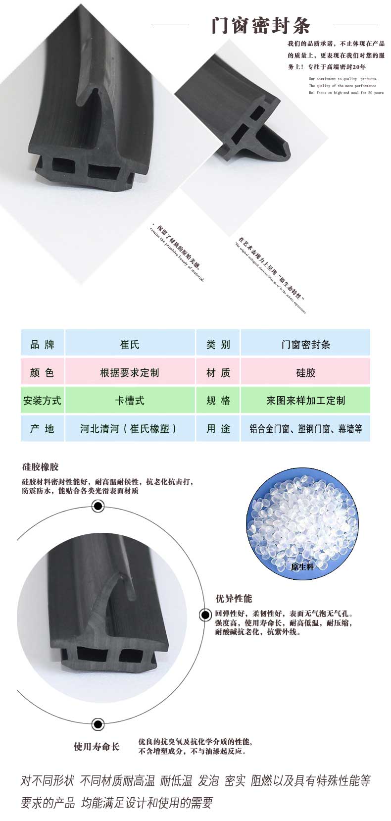 河北崔氏橡塑制品科技有限公司,具有經(jīng)驗(yàn)豐富的技術(shù)人員,專(zhuān)業(yè)的研發(fā)團(tuán)隊(duì),優(yōu)質(zhì)的服務(wù),大批量供應(yīng),產(chǎn)品通過(guò)國(guó)際質(zhì)量認(rèn)證,價(jià)格合理,供貨迅速。我公司將根據(jù)客戶(hù)的來(lái)樣或圖紙進(jìn)行開(kāi)發(fā)訂做,也可根據(jù)型材口型進(jìn)行研發(fā)。我公司將全程為廣大客戶(hù)解決產(chǎn)品的技術(shù)問(wèn)題,并鄭重承諾如出現(xiàn)任何質(zhì)量問(wèn)題將無(wú)條件退貨。
