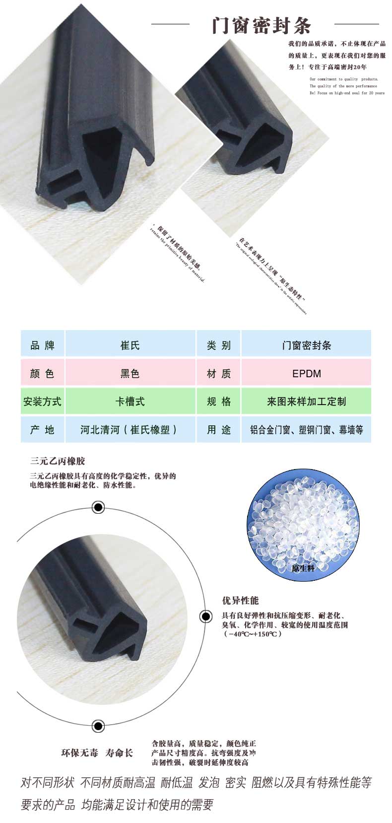 河北崔氏橡塑制品科技有限公司,具有經(jīng)驗(yàn)豐富的技術(shù)人員,專業(yè)的研發(fā)團(tuán)隊(duì),優(yōu)質(zhì)的服務(wù),大批量供應(yīng),產(chǎn)品通過國際質(zhì)量認(rèn)證,價(jià)格合理,供貨迅速。我公司將根據(jù)客戶的來樣或圖紙進(jìn)行開發(fā)訂做,也可根據(jù)型材口型進(jìn)行研發(fā)。我公司將全程為廣大客戶解決產(chǎn)品的技術(shù)問題,并鄭重承諾如出現(xiàn)任何質(zhì)量問題將無條件退貨。