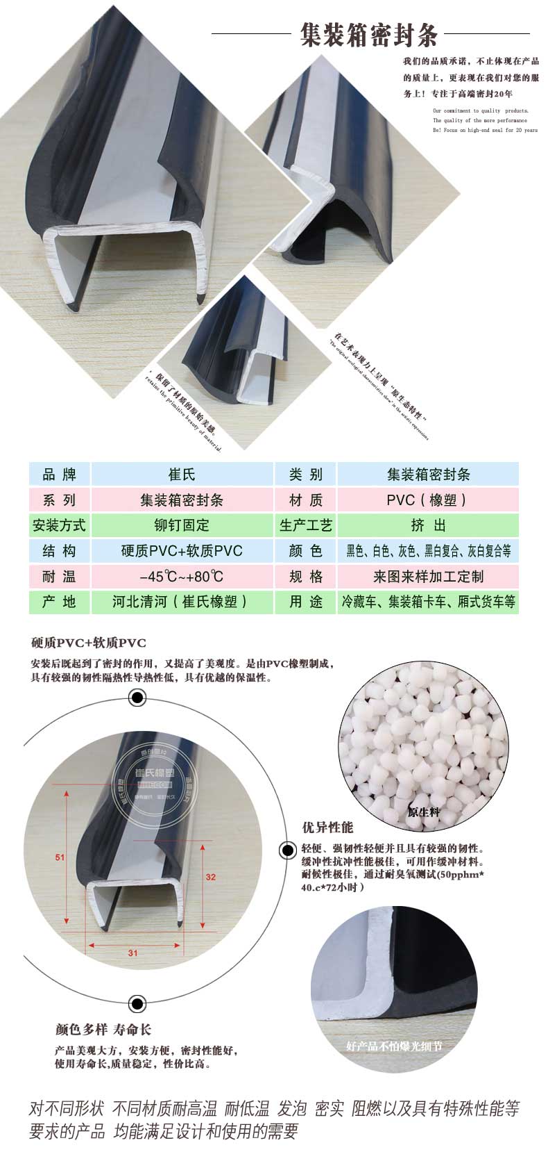 崔氏集裝箱密封條使用環(huán)境溫度為-45℃~+80℃,通常采用PVC材質(zhì)進(jìn)行生產(chǎn),正常條件下,使用壽命不少于5年