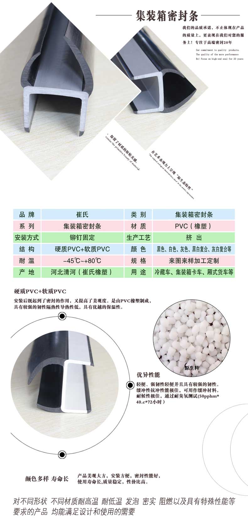 崔氏集裝箱密封條使用環(huán)境溫度為-45℃~+80℃,通常采用PVC材質(zhì)進行生產(chǎn),正常條件下,使用壽命不少于5年