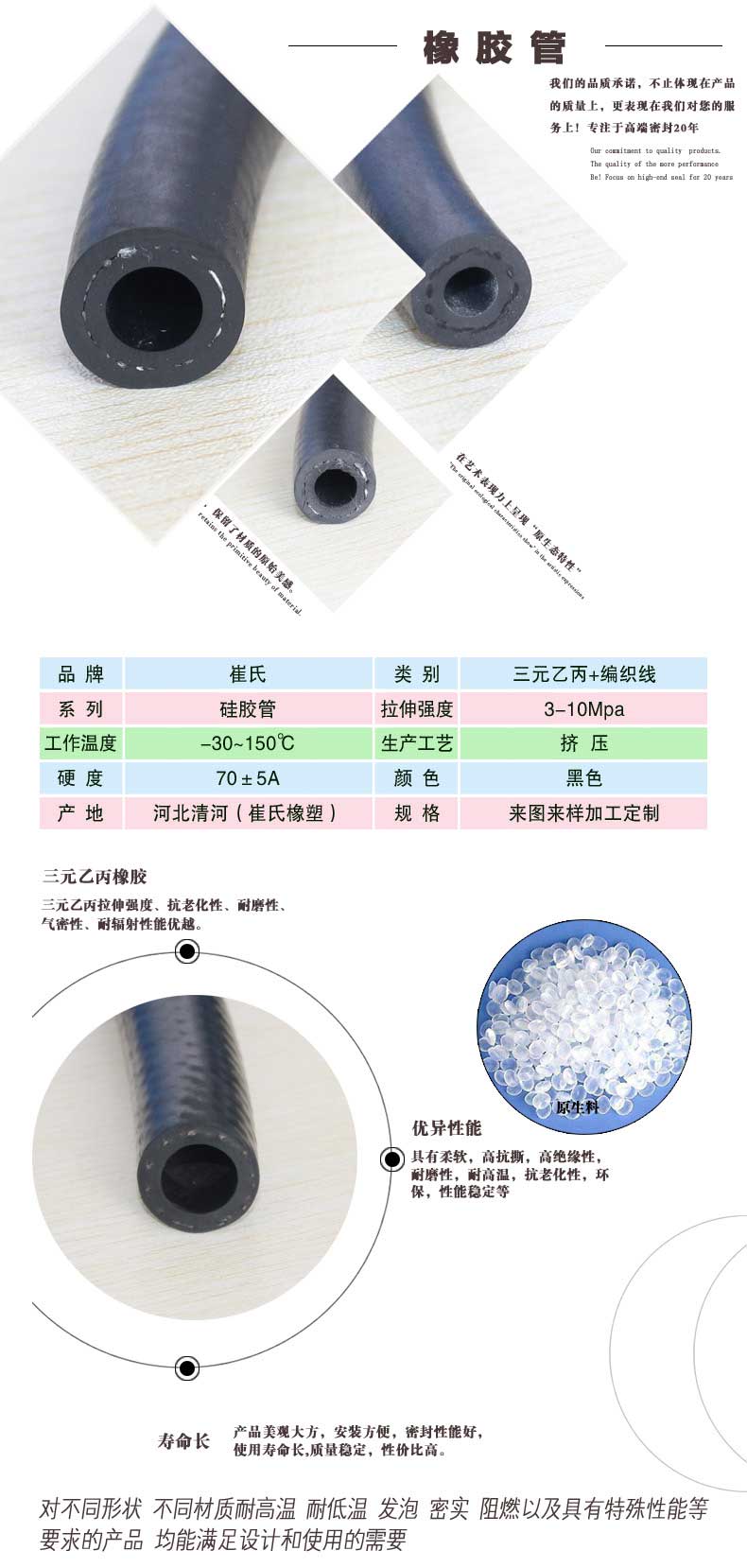 主要性能橡膠管的特性還有;生理惰性、耐紫外線、耐臭氧、耐高低溫(-80至300度)、透明度高、回彈力強(qiáng),耐壓縮永久不變形、耐油、耐沖壓、耐酸堿、耐磨、難燃、耐電壓、導(dǎo)電等性能。