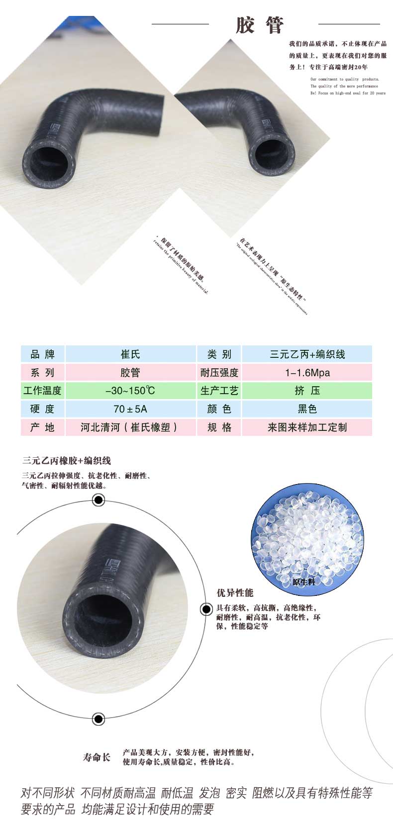 主要性能橡膠管的特性還有;生理惰性、耐紫外線、耐臭氧、耐高低溫(-80至300度)、透明度高、回彈力強(qiáng),耐壓縮永久不變形、耐油、耐沖壓、耐酸堿、耐磨、難燃、耐電壓、導(dǎo)電等性能。