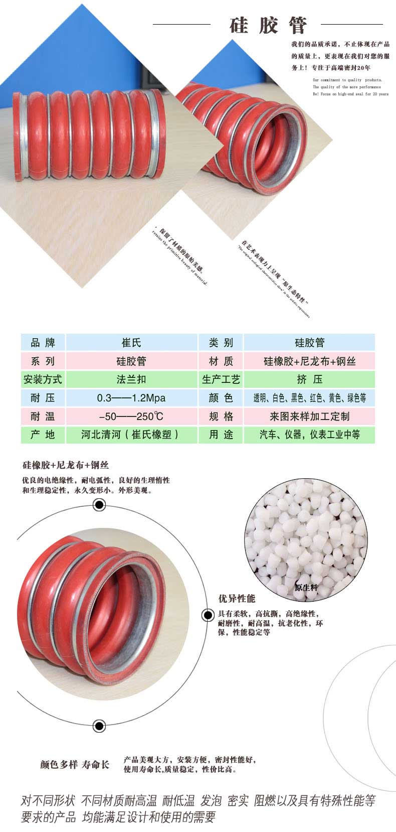 采用專業(yè)的耐高低溫硅膠原材料制成,主要用于高溫高壓等特殊環(huán)境作業(yè),類似的特殊環(huán)境用途硅膠管還有編織(增強(qiáng))硅膠管、硅膠復(fù)合管等產(chǎn)品